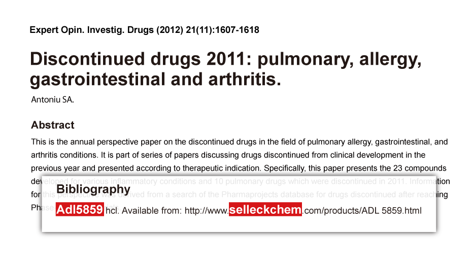 | In vivo | At the screening dose of 3 mg/kg p.o., ADL5859 produces 100% reversal of hyperalgesia in the inflamed paw. The oral ED50 of ADL5859 in the FCA mechanical hyperalgesia assay is 1.4 mg/kg. The antihyperalgesia produced by ADL5859 (3 mg/kg, p.o.) is reversed by pretreatment with the δ opioid antagonist naltrindole (0.3 mg/kg s.c.), thus demonstrating a δ receptor mediated effect.In the rat forced swim assay, ADL5859 (3 mg/kg p.o.) produces robust antidepressant-like activity, as evidenced by a significant decrease in the time spent immobile and a significant increase in the time spent swimming. The bioavailability of ADL5859 (3 mg/kg p.o.) in rats and dogs is 33% and 66%, respectively.[1]ADL5859 efficiently reduces inflammatory and neuropathic pain mainly by recruiting δ-opioid receptors expressed by peripheral Nav1.8-expressing neurons.[2] |