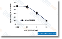 The pyridinylquinoline derivative GSK1059615 is a novel, ATP-competitive, and reversible inhibitor of the class I family of PI3Ks. GSK1059615 inhibits PI3K signaling, induces G1 arrest and apoptosis, especially in breast tumor cells. [2] Data summarized in another review also shows that GSK1059615 inhibits PI3Kα, β, γ and δ, with Ki of 0.42 nM, 0.6 nM, 0.47 nM and 1.7 nM, respectively. [3] Another report shows that GSK1059615 inhibits PI3Kα with IC50 of 2 nM. In T47D and BT474 cancer cells, GSK1059615 inhibits the phosphorylation of Akt at S473, with IC50 of 40 nM. [4] |