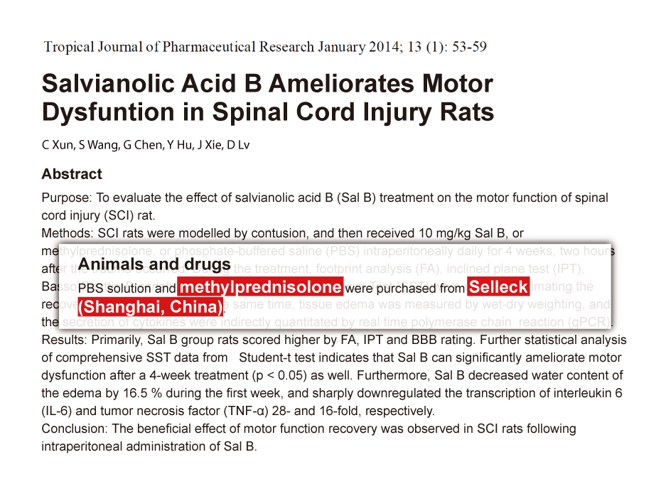 | In vivo | Methylprednisolone decreases RGC survival in rats with electrophysiologically diagnosed optic neuritis. Methylprednisolone decreases RGC survival by a nongenomic, calcium-dependent mechanism. Methylprednisolone-induced enhancement of RGC degeneration depends on calcium influx through voltage-gated calcium channels. [2] Methylprednisolone treatment leads to a significant decrease in the number of ED1-positive cells in both rostral and caudal stumps. Methylprednisolone treatment results in a significant reduction in tissue loss in both cord stumps at 2, 4 and 8 week post-injury. Methylprednisolone leads to a long-term reduction of ED1-positive cells and spinal tissue loss, reduced dieback of vestibulospinal fibres, and a transient sprouting of vestibulospinal fibres near the lesion at 1 and 2 weeks post-lesion. [3] Methylprednisolone at a dose of 30 mg/kg which has been shown to be effective in improving functional outcomes in rat SCI models, suppresses TNF-α expression and NF-kB activation. Methylprednisolone inhibition of NF-kB function is likely mediated by the induction of IkB, which traps NF-kB in inactive cytoplasmic complexes. [4] |