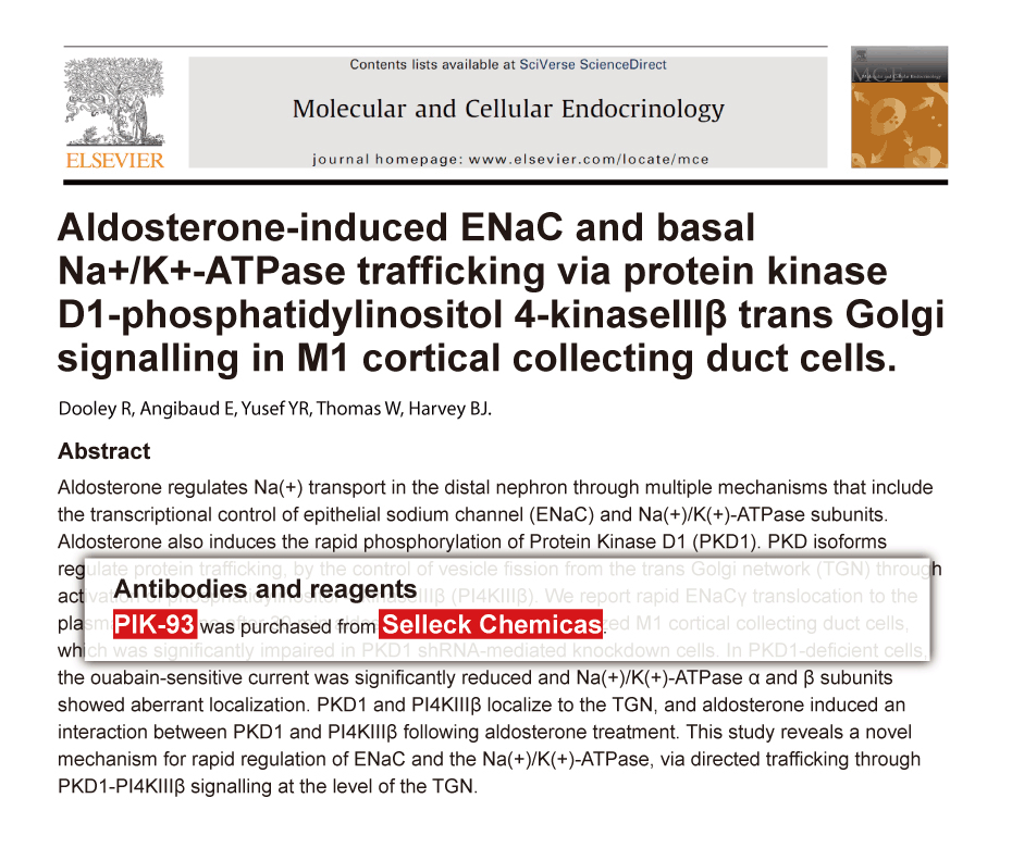 PIK-93 is the first potent, synthetic PI4K (PI4KIIIβ) inhibitor with IC50 of 19 nM; shown to inhibit PI3Kα with IC50 of 39 nM.