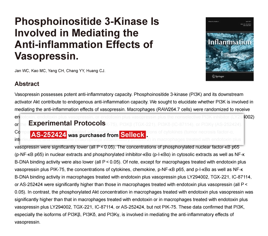 Inflammation, 2017, 40(2):435-441. AS-252424 purchased from Selleck.