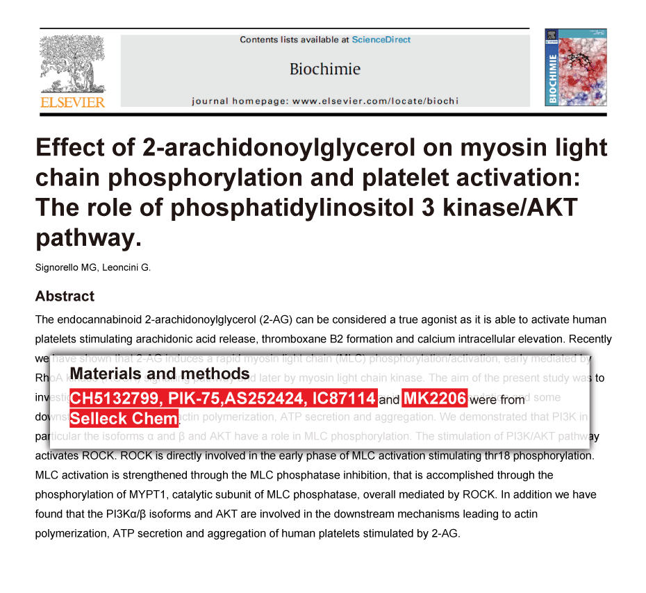 | Description | AS-252424 is a novel, potent PI3Kγ inhibitor with IC50 of 30 nM in a cell-free assay with 30-fold selectivity for PI3Kγ than PI3Kα, and low inhibitory activity towards PI3Kδ/β. | |||||||||||||||||||||||