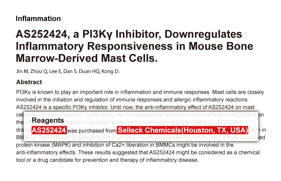 AS-252424 is a novel, potent PI3Kγ inhibitor with IC50 of 30 nM in a cell-free assay with 30-fold selectivity for PI3Kγ than PI3Kα, and low inhibitory activity towards PI3Kδ/β.