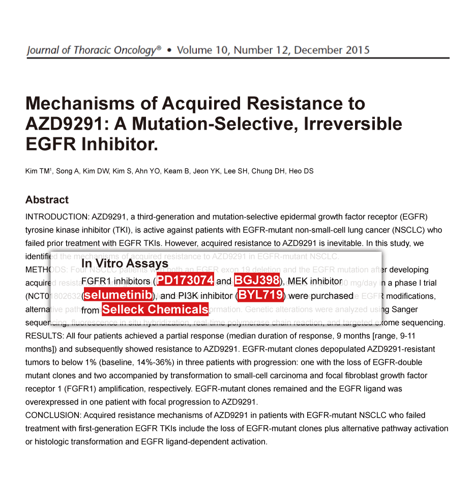 | In vivo | BYL719(>270 mg/d) shows statistically significant dose-dependent anti-tumor efficacy in PIK3CA mutant xenograft models in rodents. BYL719 has a low clearance, a half-life of 8.5 h and its exposure increases dose proportionally between 30mg/d and 450mg/d, displaying a low inter-individual variability in Cmax and AUC in human. BYL719(270mg/d) shows first signs of clinical efficacy include 1 confirmed partial response in a patient with ER+ breast cancer, and significant PET responses (PMR) and/or tumor shrinkage are achieved in 8 out of 17 evaluated patients. [1] |