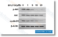 A549 cell was trypsinized and plated at 50% confluence in DMEM. 16 hours later, BYL719 was added at final concentrations of 0, 1, 5, 10 and 20uM. Another 24 hours later, cells were harvested in RIPA with protease and phosphatase inhibitor cocktail. Total protein concentration was measured by BCA method. Lysates equivalent to 20ug total protein were subject to Western Blot, using total- AKT, pS473-AKT, pT286-CyclinD1 and beta-actin (internal control) antibodies.