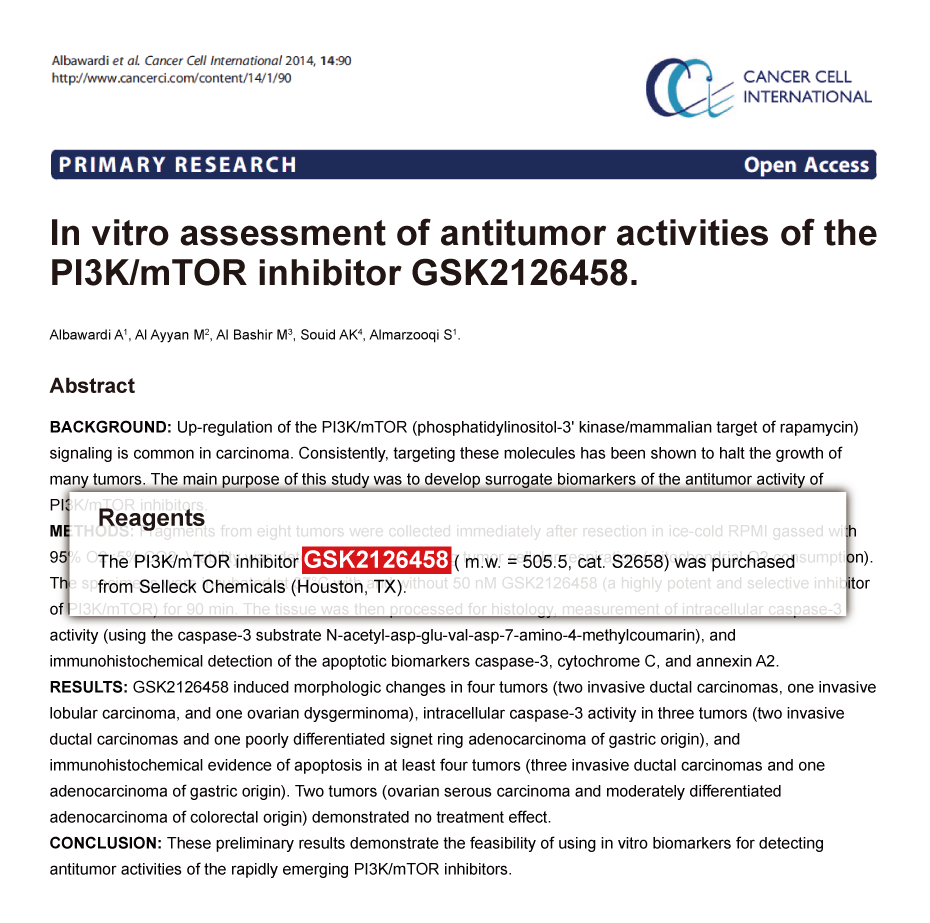 | In vivo | In a BT474 human tumor xenograft model, GSK2126458 treatment results in a dose-dependent reduction in pAkt-S473 levels, and exhibited dose-dependent tumor growth inhibition at a low dose of 300 μg /kg. Besides, GSK2126458 shows low blood clearance and good oral bioavailability in four preclinical species (mouse, rat, dog, and monkey). [1] |